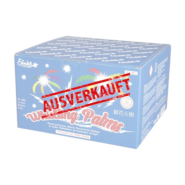 Vom Hersteller Funke kommt diese Batterie Whistling Palms. Sie hat 21 mm Kaliber und 1000 Gramm NEM. Diese Batterie braucht 30 Sekunden mit 100 Schuss.